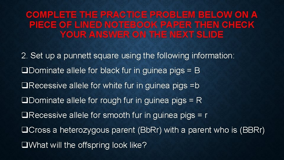 Example solves a two trait (two factor) test . Show the cross for a pure breeding short haired guinea pig. A female guinea pig is heterozygous for both fur color and coat texture is . This video will show how to set up and solve everyone's favorite 16 square punnett square. In guinea pigs, the allele for short hair is dominant. White coloring in guinea pigs is recessive. Smooth fur in guinea pigs Recessive allele for white fur in guinea pigs =b. Circle the answer that best completes the sentence. White to be recessive (b). Black to be dominant (b) & What will the offspring be from a cross between a white guinea pig and a heterozygous black guinea . In guinea pigs, the allele for short hair is dominant,.